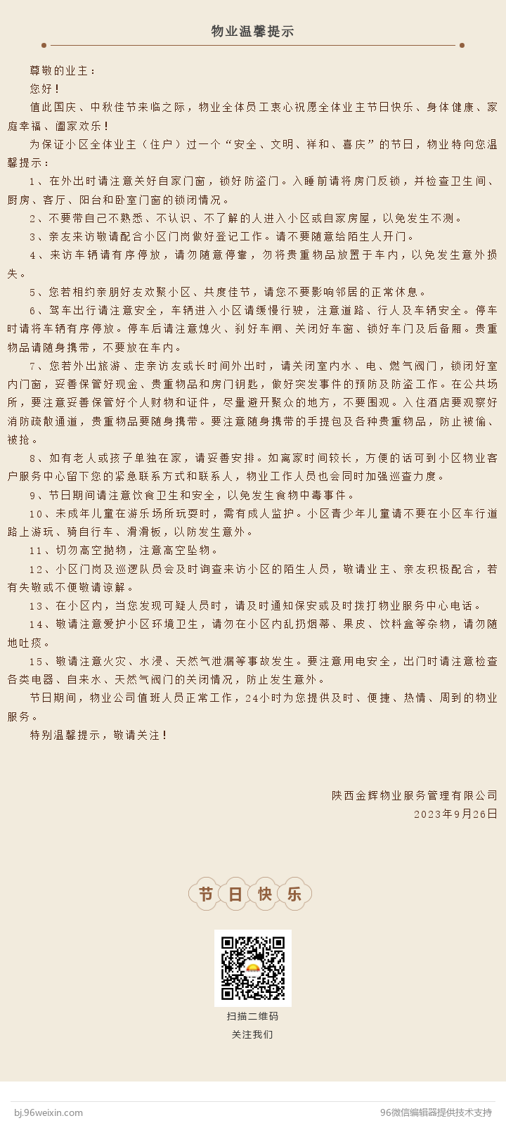 值此双节来临之际,物业全体员工衷心祝愿全体业主节日快乐、身体健康、家庭幸福、阖家欢乐!